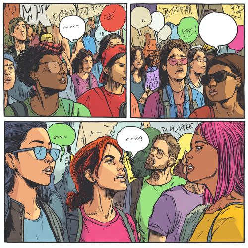 Craft a riveting multi-panel comic page depicting a transgender rights protest, with each panel capturing a different moment of intensity and excitement, utilizing dynamic composition and pacing to bring the scene to life. Ensure the incorporation of thought bubbles, speech balloons, or sound effects to convey dialogue, inner thoughts, and the atmosphere of the scenario, thus embracing the quintessential elements of comic book storytelling. Make sure each speech bubble fits inside the associated panel. Add a small border around the edge of the image and each panel