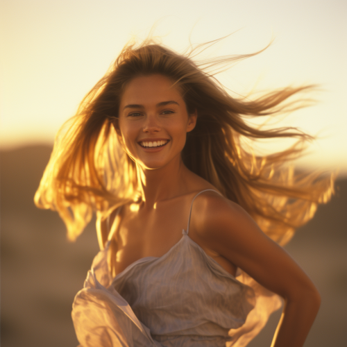 denise richards at age 20, full body photo, wildly dancing and spinning in a blur, barefoot in a light dress, hair flying, golden hour, over desert dunes. Her head is thrown back, smiling widely, not looking at the camera.
