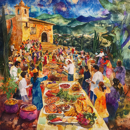 Fiesta de Santiago Apóstol watercolor mixed media collage illustration, festive colors, a community gathering or a family meal to honor this celebration, focusing on local traditions and delicious regional dishes.