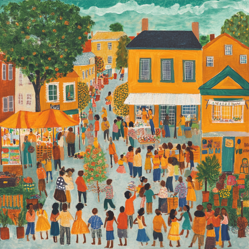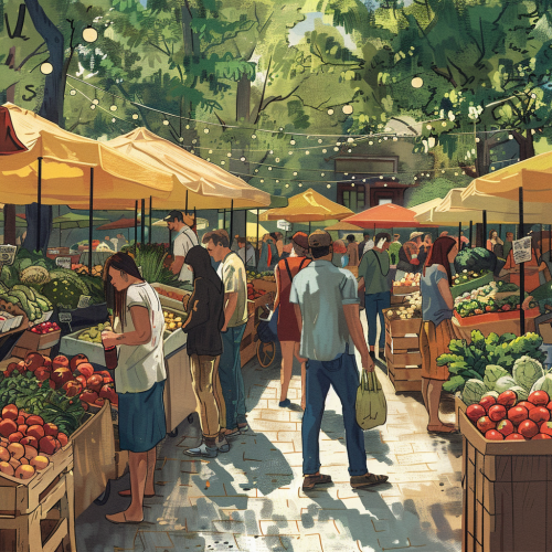 A vibrant urban farmers market with stalls selling fresh produce, handmade goods, and artisanal products. The community gathers to shop and socialize in a lively, outdoor setting, 1:1 --v 6.0