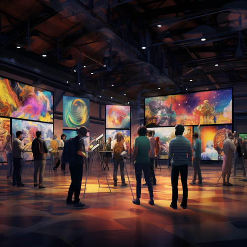 a venue bustling with community engagement. People are conversing energetically, surrounded by digital NFT-style art displayed as posters. Capture this scene through a sharp, wide-angle lens to encompass the vibrant atmosphere and intricate details of the space
