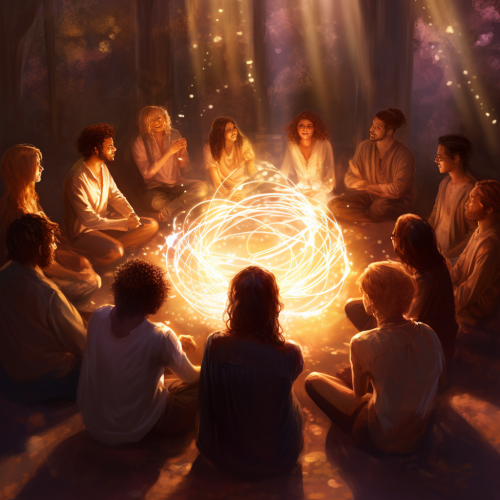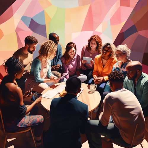 A warm, inviting image of a diverse group of people engaging in conversation or a digital illustration symbolizing a supportive community.