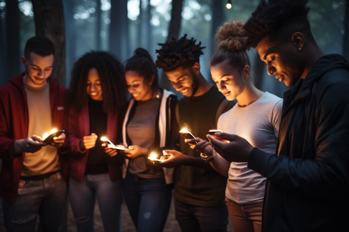 lifestyle shot of a group of young men enjoying smartphones in a community gathering, all wearing modern clothes, jeans, t-shirts and jogging pants, warm lightning, realistic photograph --ar 3:2
