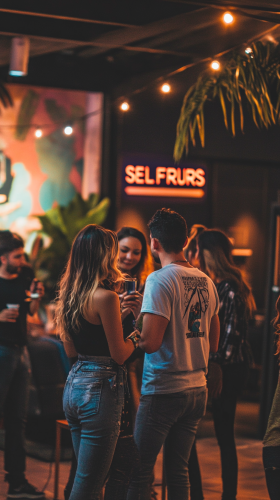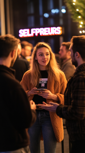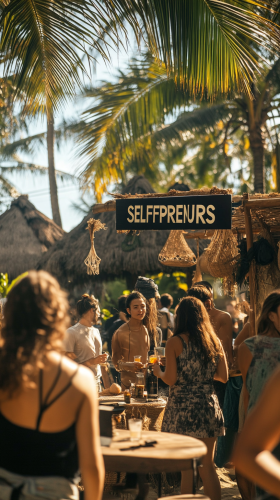 a community of selfpreneurs gathering together on event, selfpreneurs is a community of content creators that sold a digital product and have digital marketing & ai system to optimize theirs business models that runs semi passive income, on that gathering looks casual, enjoy, people talking each other, warm, in that event theres a signage "SELFPRENEURS" --ar 9:16 --v 6.1
