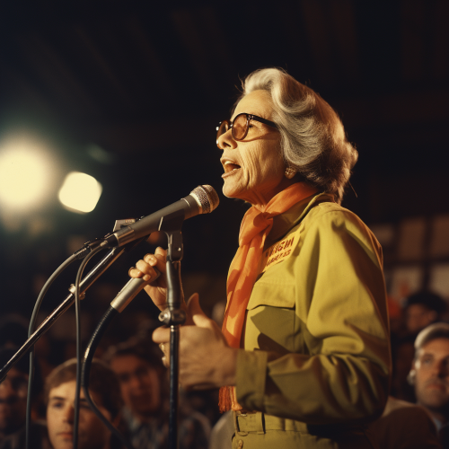 1970s progressive political candidate speech on election night,old woman candidate, photography, yellowish greenish red tones