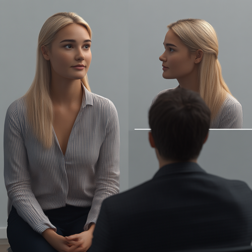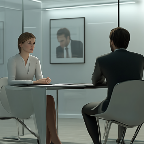 Generate a photorealistic version of A photorealistic scene of a professional interview setting, with a confident candidate sitting across from an interviewer. The background should be in light grey color, and the atmosphere should be formal and focused, capturing the essence of answering common interview questions. --ar 1:1 --quality .5