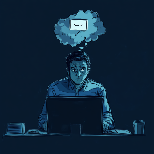 Generate a digital art for A digital art scene showing a candidate sitting at a desk with a computer, looking worried and confused, with a thought bubble showing a missed email notification. The background is dark grey, symbolizing the color black, to emphasize the seriousness of neglecting follow-up. --ar 1:1 --quality .5