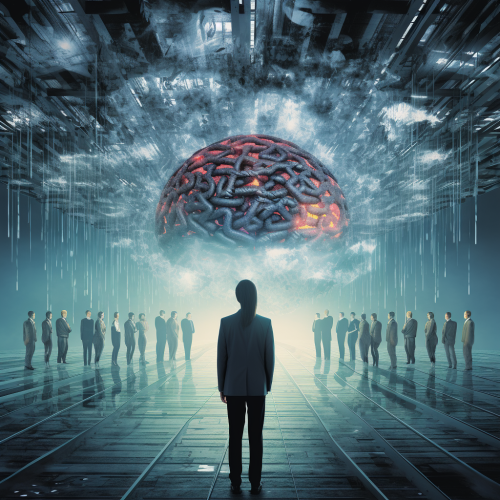 Generate a digital art for A digital art scene showing a candidate in a virtual interview looking confused and unprepared, with a cluttered desk and a blank expression, emphasizing lack of preparation. Use black color prominently. --ar 1:1 --quality .5