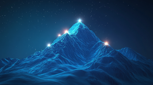 A vivid and dynamic illustration symbolizing the concept of achieving goals. A person standing on top of a mountain peak, arms raised triumphantly, with a clear blue sky and sunlight shining down, representing success and accomplishment. In the background, a series of progressively smaller mountains or steps leading up to the highest peak, symbolizing the journey and challenges overcome. Include elements like a distant flag planted at the summit, and abstract lines or arrows pointing upwards to emphasize direction and ambition. --ar 3:4 --v 6.1