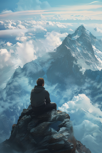Man sitting alone on a mountain peak: His face is partially shadowed, showing deep reflection, surrounded by vast landscapes of mountains and clouds, a mix of solitude and hope in the atmosphere, realistic, --v 6.0 --ar 2:3