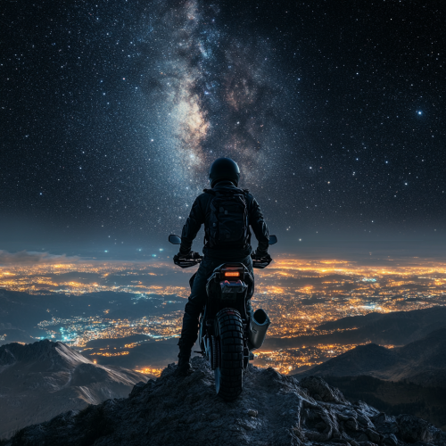 a hyper realistic image in landscape motorcyclist standing on the mountain top looking at a the cityscape below its a night shot with the milky way about and the city lights beneath the mountain sharp ultra realistic professional lighting