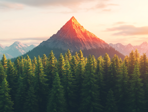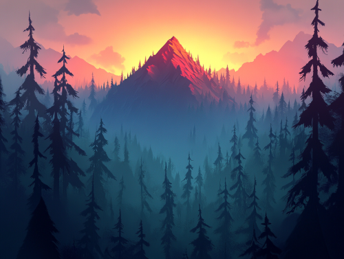 A small mountain peak in a vast forest. The forest is massive, vast, lush, thick, seemingly impenetrable, with no clearings. Many of the trees are big with thick dark stems. The forest has a mystical energy about it. A short mountain range appears in the center. The mountain is colored red by a setting sun. Fantasy RPG setting, wide angle. --ar 4:3 --v 6.1