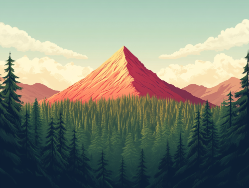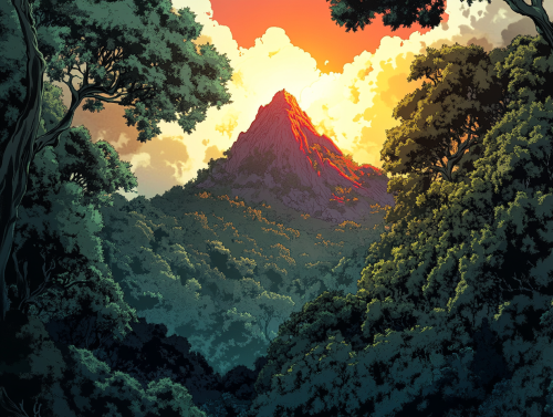 A tiny mountain peak in a vast temperate forest. The trees are massive, old, thick, green, and the forest is seemingly impenetrable, with no clearings, and many different kinds of trees reaching to the horizon. The forest has a mystical energy about it. A tiny mountain appears in the center. The mountain is colored red by a setting sun, as are the clouds. Fantasy RPG setting, wide angle, detailed, dramatic atmosphere. --ar 4:3 --v 6.1