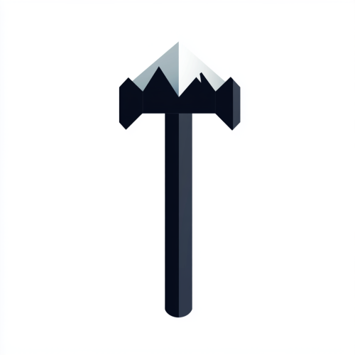 A minimalist icon of a hammer with clean, angular lines, where the handle is a solid black bar, and the head is shaped like a mountain peak, symbolizing the enduring strength of both human creation and nature, fused into one powerful tool. Art Style: Minimalist Symbolism