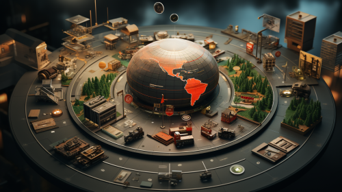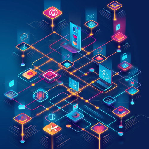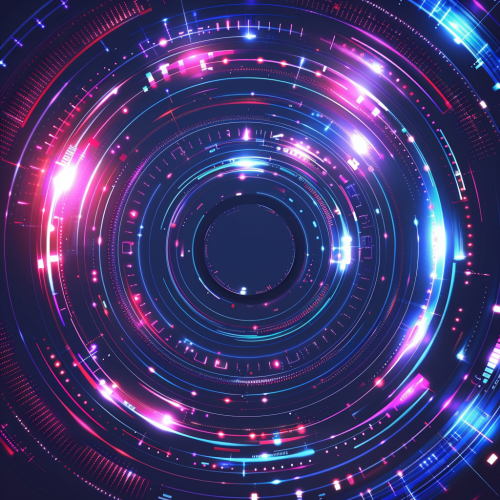 High-tech, futuristic digital background with concentric circles, glowing neon lights, and subtle geometric patterns. Vibrant tones of electric blue, purple, and red blend seamlessly, creating a sense of depth and digital connectivity. No text or symbols, just abstract technological elements, data lines, and light trails to evoke a digital ecosystem in a clean and minimalist style --v 6.0