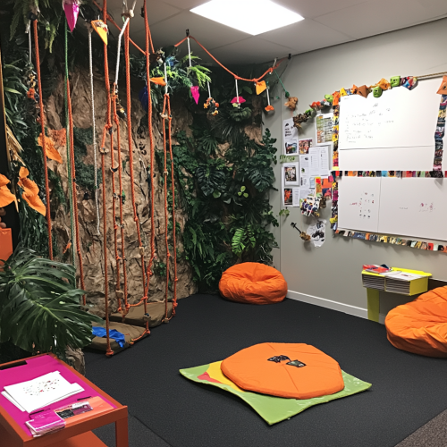Play space with climbers, rope bridges, walls simulating Michoacán ecosystems, where collaborative mission games are held to solve problems. There are plenty of stationery supplies and whiteboards for creating resolution strategies.