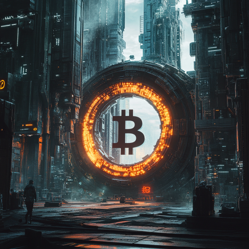 a futuristic, sci-fi aesthetic, with the central image depicting a large circular window or opening that looks out onto a bitcoin ecosystem show big scifi glowing bitcoin outside circle