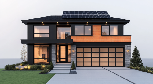 3D rendering of a modern two-story house with solar panels on the roof, front view. The house has a black color scheme with orange brick walls, white concrete windows, and a garage door with a large glass window. The background is a light gray, with natural daylight illuminating the scene. The image is highly detailed and of high resolution. --ar 22:9