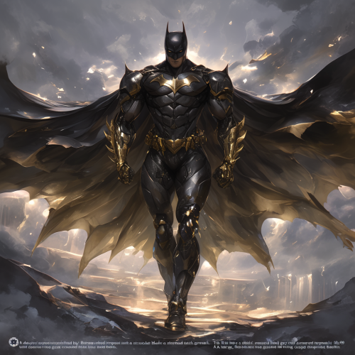 "A dark, powerful superhero inspired by Batman standing tall and imposing in a cinematic 16:9 format. The hero wears a sleek, muscular black and dark gray armored suit with golden accents on the gauntlets and boots. A large, flowing black cape drapes behind him, and the hero’s mask features sharp bat-like ears. The background is a stormy, dramatic sky with dark clouds and subtle lighting illuminating the hero, creating an intense atmosphere. The hero stands on a cracked, rocky surface, exuding strength and determination in the face of adversity." --s 750 --style raw --niji 6