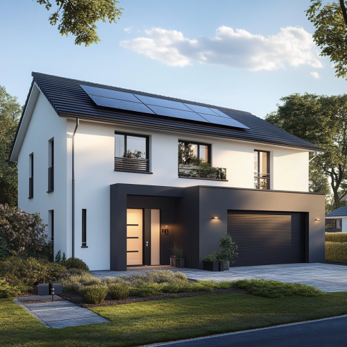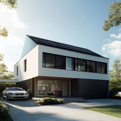 A highly aesthetic 3D rendering of a contemporary house in Alsace. The house features modern aluminum windows with rolling shutters and is equipped with sleek, modern solar panels on the roof. With modern garage. The scene is captured in broad daylight with a wide-angle view, showcasing the house’s design in a very high-quality image.