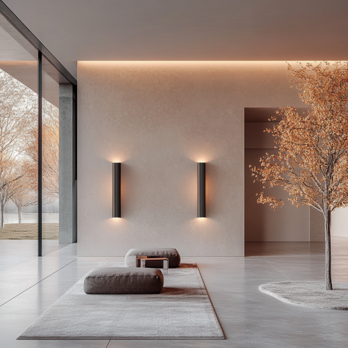 Inside a modern house, two sleek, black cylindrical wall lights with warm white illumination are positioned on the left and right sides of each other against a plain background. Each light features two circular lamps. The scene is well-lit with warm colors, eliminating any shadows or reflections on the walls.