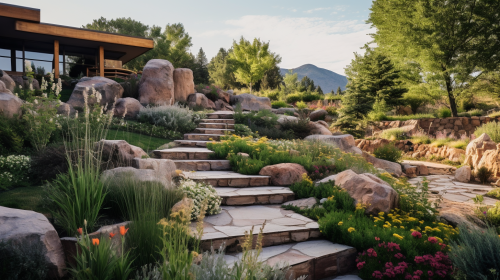 Contemporary backyard garden with quartzite rocks as part of the landscaping, located in the Colorado mountains, in the style of Dwell magazine, editorial photography --ar 16:9