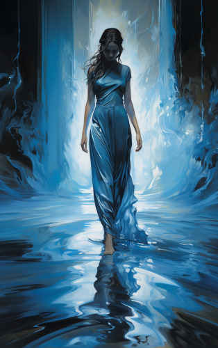 Describe a mesmerizing scene where liquid chrome flows, its surface reflecting deep blues and shadows, creating a dance of light and darkness --ar 10:16 --s 250