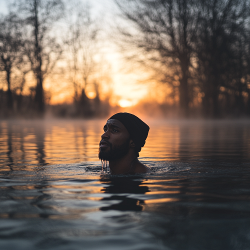 a brisk morning, 1 man is in a lake submerged up to his neck. mid 30s . he's african. he is cold, the water has took his breath away. There is trees in the background and the sun is just rising. The photo is a wide shot taken on a sony a7iV on 14mm lens. he is holding the camera like its a selfie. he is shouting in pain. it should be hyperrealistic and 8k. he is wearing a beanie