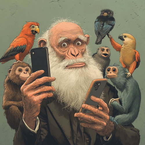 Create a funny meme showing Charles Darwin observing a group of different animals gathered around a smartphone, all trying to take a selfie. Include a monkey, a bird, a fish, and a human, all posing awkwardly in front of the phone. Darwin looks puzzled, scratching his head, with a caption that reads: 'This wasn’t exactly what I meant by natural selection.' Use a playful, cartoonish style