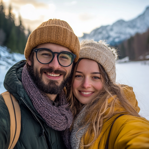a couple (30y.o) taking selfie in the mountains, in the style of social media portraiture, anglocore, smilecore, emotive faces, object portraiture specialist, ARRIFLEX 35 BL Camera, Canon K35 Prime Lenses, --style raw