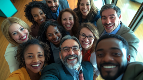A group selfie of smiling, diverse business people in an office. Taken with a Nikon D850 camera and a 24mm f/3.6 lens at F/8 and ISO 400, with natural lighting. In the style of a raw, unedited photograph. --ar 16:9
