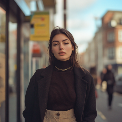 superrealistic, a woman posing on street, in the style of social media portraiture, anglocore, smilecore, elegant, emotive faces, object portraiture specialist, ARRIFLEX 35 BL Camera, Canon K35 Prime Lenses, LinkedIn profile photo --style raw