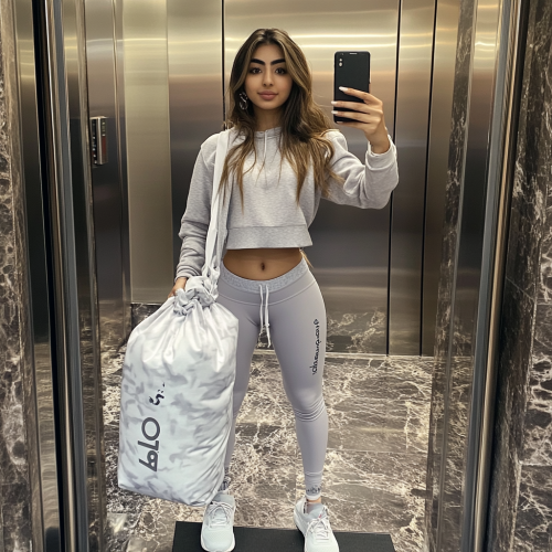 A young Iranian woman heading to a yoga studio, carrying a large 'Alo Yoga' bag over her shoulder and holding a water bottle in her hand. She is wearing white New Balance sneakers and 'Alo Yoga' leggings, and she has a yoga mat with her. She is taking a selfie in front of an elevator mirror. Style: realistic and detailed.