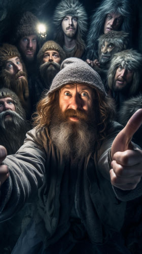 cave man taking a selfie, flash, surrounded by 10 other cave men --ar 9:16