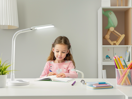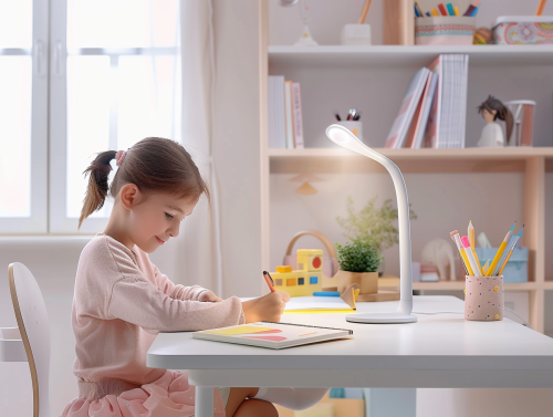 This image captures a children’s study corner with a neutral LED desk lamp casting a gentle but focused light on the study area. The desk is organized with school supplies, a notebook, and a small plant. A child sits at the desk, attentively reading, with a white and pastel-colored background typical of a modern Polish interior, suggesting a perfect space for learning --ar 4:3 --s 50 --v 6.0