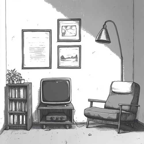 a minimalist scene of a wall in a flat on the wall there are a few pictures and a small tv set, in a corner there is a floor lamp and a small armchair next to a bookshelf, in black and white, anime comic manga copicmarke --v 6.1