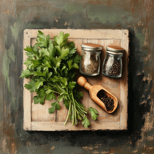 "Small still-life of herbs and spices – includes a tiny bunch of parsley, a few small spice jars, and a wooden scoop with peppercorns, grouped together in a soft, rustic style. The arrangement adds a cozy and inviting look to recipe card corners, creating a natural kitchen atmosphere.