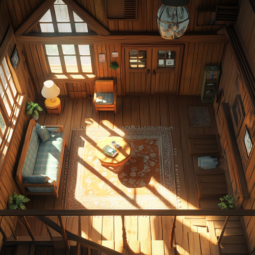 Interior of an old wooden Chalet without too much furniture, natural light, sofa, table and chairs, lamp, front door, windows, pixar style, animated drawing, 3D, top view, 4k, ar 16:9