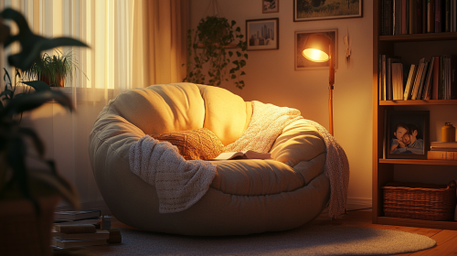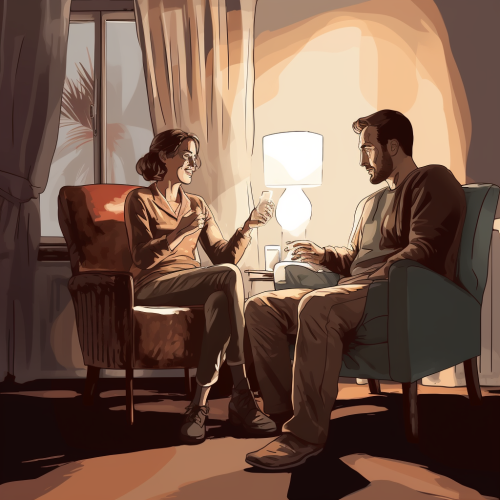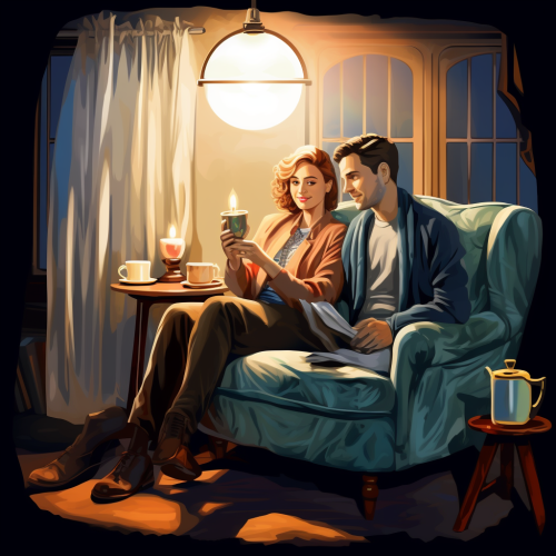 married couple, the light of a lamp and a soft blanket on an armchair in the corner of a new apartment, symbolizing the coziness and comfort that the company gives to its residents , comic style