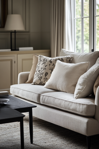 A photograph of the corner sofa in an American-style living room, featuring beige linen fabric and black legs. The couch is adorned with various pillows, creating soft shadows on its surface under natural light. A coffee table sits beside it, adding to the cozy atmosphere. This scene captures the comfortable ambiance of home decor. Captured with a Fujifilm GFX 50S camera, using a 32-64mm lens at an f/8 aperture setting and an ISO setting from a distance --ar 2:3