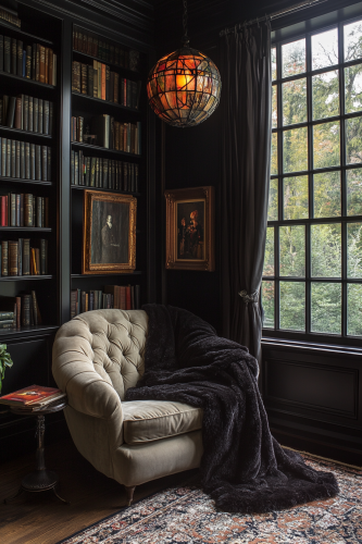Design a cozy corner that embodies Nocturnal Nooks, perfect for late-night reading or contemplation. A plush armchair draped with a velvet throw, situated by a large window with heavy curtains, sets the mood. A small bookshelf filled with gothic literature and dark, moody paintings enhance the theme, while a floor lamp with a stained glass shade offers soft illumination. The nook should be secluded, surrounded by dark walls and shelves, creating a private escape within the home. This intimate setting should draw viewers into its embrace, promising solace and mystery. Neat and organized. Camera: DSLR - Canon EOS 5D Mark IV. Lens: Canon EF 24-70mm f/2.8L II USM. Composition: Wide shot, room-centered, horizontal orientation, balance between furniture and space. Film: Digital, high resolution, color profile sRGB. Camera settings: ISO 400, f/2.8, 1/60 sec. --ar 2:3 --v 6.1 --s 250