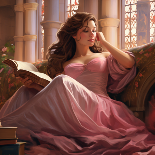 A photorealistic, hyperrealistic image of Belle with long brown hair, wearing a simple pink day dress, not a ball gown. She is curled up in a large, plush armchair, covered with a cozy blanket, contentedly reading a book. The setting is a cozy book nook inside a grand library, with towering bookshelves in the background filled with colorful books. The scene is warmly lit, enhancing the inviting and comfortable atmosphere. The overall feel is serene and homey, with a touch of elegance. The color palette should feature a rich array of pink tones. Not anime style. Not cartoon style. Not fantasy style. Real photo style.
