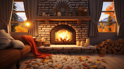 Cozy American living room with a stone fireplace, plush armchair, and a soft throw blanket, warm ambient lighting, slightly blurred to add a welcoming vibe for apparel mockups.