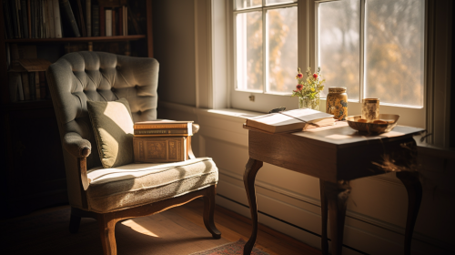 Design a cozy corner that embodies Nocturnal Nooks, perfect for late-night reading or contemplation. A plush armchair draped with a velvet throw, situated by a large window with heavy curtains, sets the mood. A small bookshelf filled with gothic literature and dark, moody paintings enhance the theme, while a floor lamp with a stained glass shade offers soft illumination. The nook should be secluded, surrounded by dark walls and shelves, creating a private escape within the home. This intimate setting should draw viewers into its embrace, promising solace and mystery. Neat and organized. Camera: DSLR - Canon EOS 5D Mark IV. Lens: Canon EF 24-70mm f/2.8L II USM. Composition: Wide shot, room-centered, horizontal orientation, balance between furniture and space. Film: Digital, high resolution, color profile sRGB. Camera settings: ISO 400, f/2.8, 1/60 sec. --ar 2:3 --v 6.1 --s 250