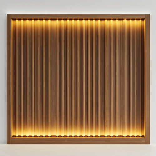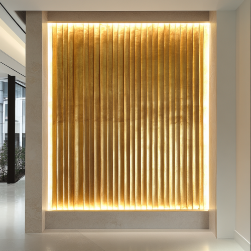 a 8' wide by 8'H wall on a white background. The wall is made of gold fluted panels with a solid frame surround. It has soft white lighting built into it.