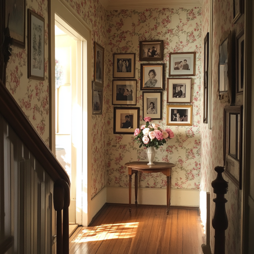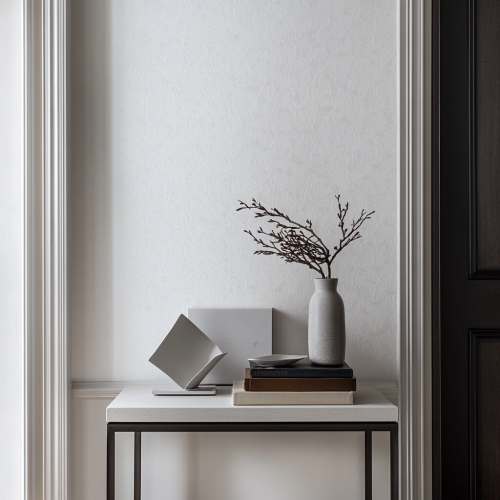 A close-up shot of a white hallway wall, focusing on a rectangular section where the wallpaper can be inserted. A narrow console table with a few minimal decor pieces, like a single book or a geometric sculpture, is partially visible in the background, subtly blurred to maintain focus on the wallpaper. The soft lighting accentuates the wallpaper’s design and texture, creating a clean and modern aesthetic.