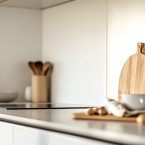 Create a close-up kitchen scene where 80% of the image is taken up by a smooth, clean white wall, perfectly even and softly illuminated with warm lighting to enhance the cozy atmosphere. At the extreme edge of the frame, there should be a very blurred hint of a simple, wooden towel rack or a corner of a kitchen island in a warm wood tone, subtly adding depth without distracting from the wall.