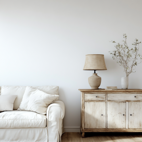 Create a close-up scene of a cozy living room where 80% of the image is dominated by a smooth, clean white wall. The wall should be perfectly even and softly lit with warm, diffused lighting to create a welcoming atmosphere. At the bottom edge of the frame, include a blurred hint of a vintage-inspired wooden cupboard with simple lines, slightly distressed in a soft, neutral color like pale cream or light grey. The cupboard should have classic, understated handles, and a light wood floor should add a subtle touch of warmth without distracting from the wall.