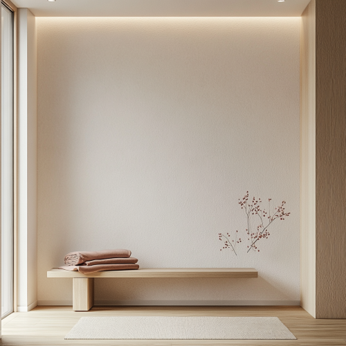 Design a minimalist hallway scene where 80% of the image focuses on a large, smooth white wall, creating a clean, open space perfect for wallpaper display. The wall should be evenly lit with soft, warm lighting to create a welcoming atmosphere. In the background, at the very edge, include a blurred, simple wooden bench with a folded, warm-colored blanket or cushion and a small section of a soft rug in muted tones, visible on a light wood floor, providing a hint of coziness without detracting from the wall.