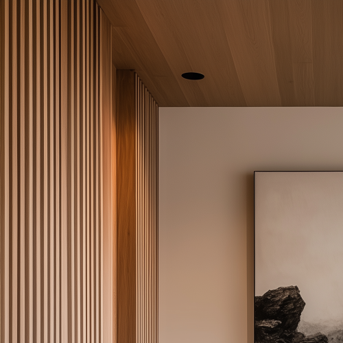 Create a close-up, minimalist home office interior where 80% of the frame is a smooth, white wall that serves as the main element. The wall should be flawlessly smooth and well-lit with soft, warm lighting to provide a cozy ambiance. At the bottom corner of the frame, include a very faint, blurred hint of a simple, flat desk edge in a light wood finish, completely uncluttered with no objects on it. The overall look should be clean and focused on the wall.